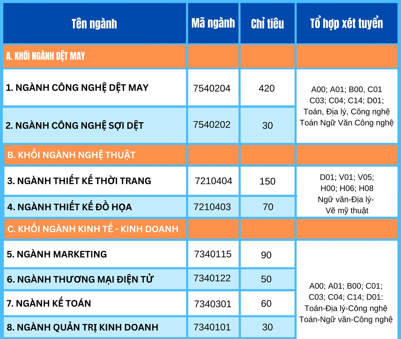 | 9 | 7540209 | Công nghệ dệt may | A00; A01; B00; C01;C03;C04;C14;D01;(Toán, Địa, Công nghệ); (Toán, Văn, Công nghệ) |
